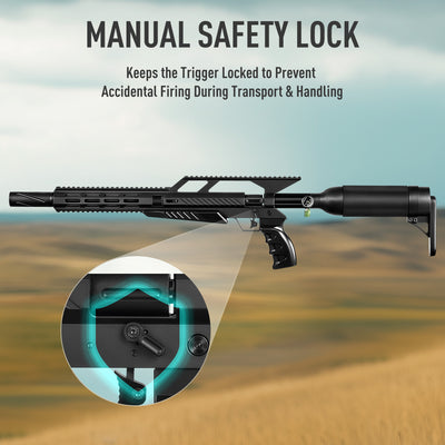 The air pressure gauge lets you easily check your air supply, keeping you ready for action. The manual trigger safety lock ensures safe handling by preventing accidental firings during storage, transport, and use